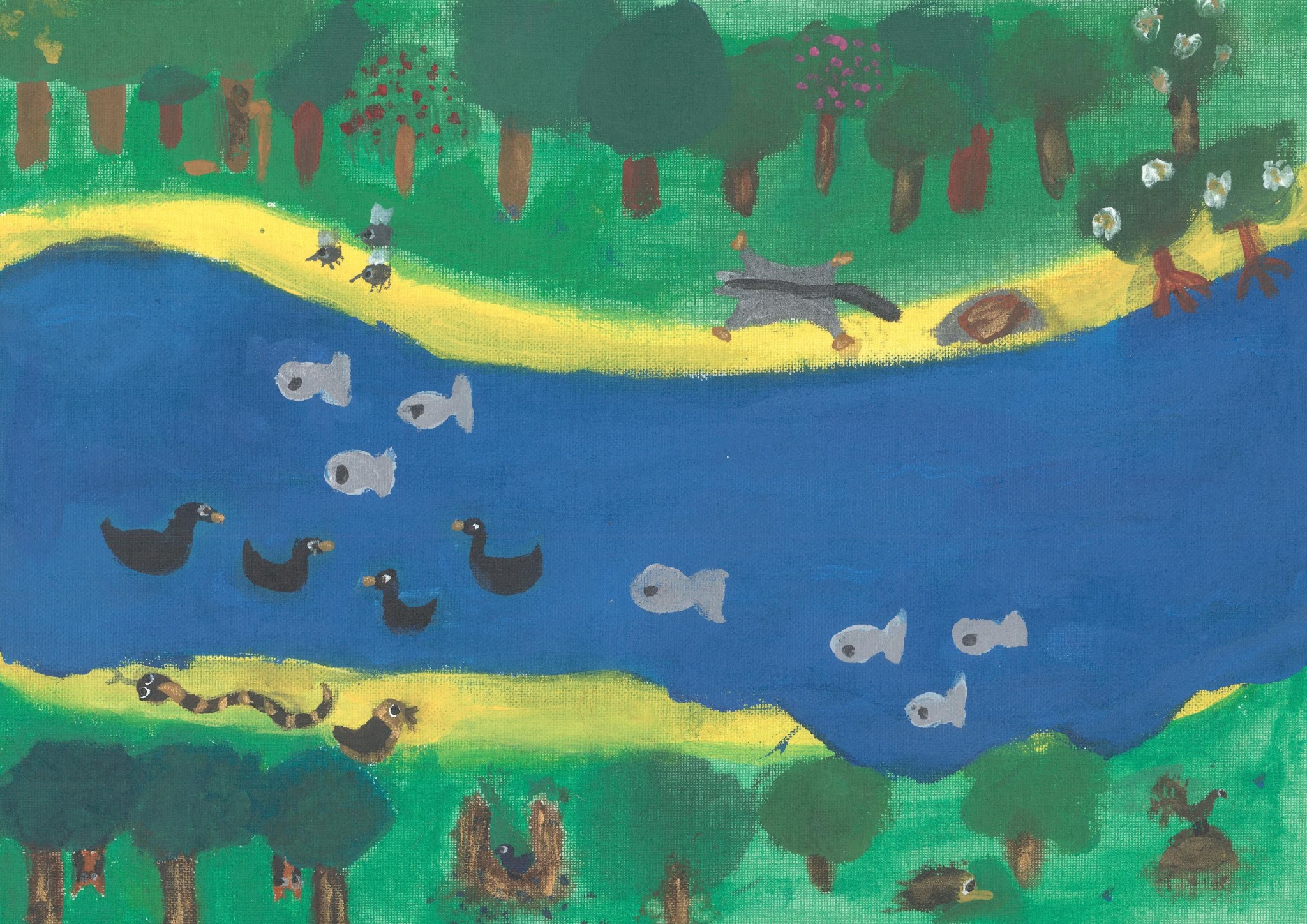 The illustrations created by the students spread across the pages with deep vivid colours and add to a sense of the seasonal changes.